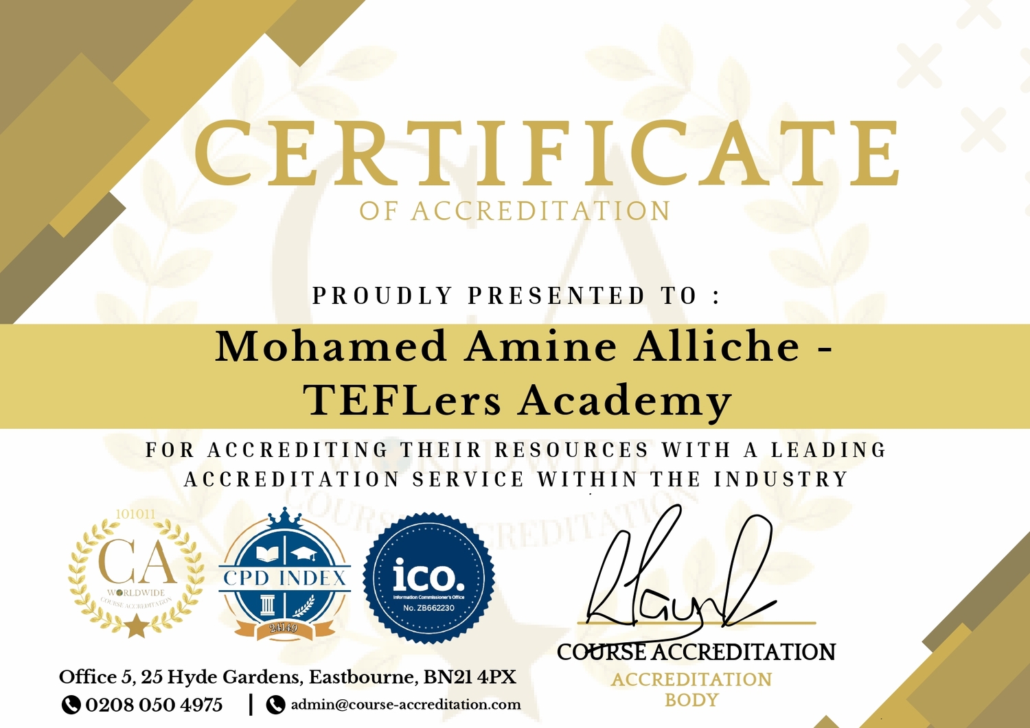 4- TEFLers Academy is internationally-accredited by Course Accreditation (CA), UK, one of the leading accreditation bodies in the UK and globally , which is a proof of our Academy's good standing and commitment to providing high-quality courses